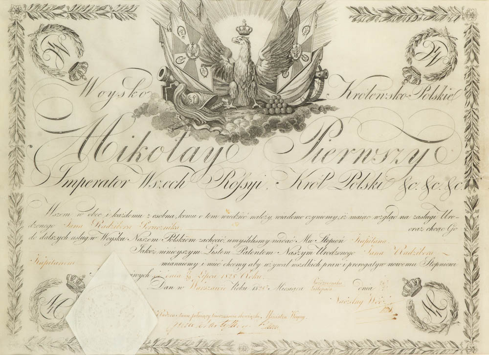 ![]() 99. Patent ofi cerski. Z podpisem Wielkiego Księcia Konstantego i z pieczęcią Mikołaja I. 1828. |