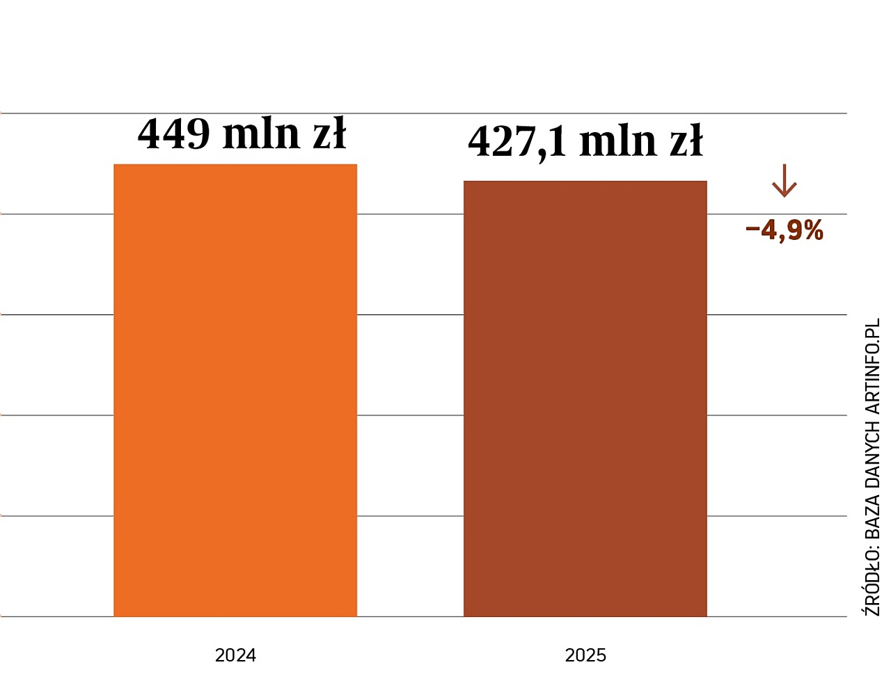 Najnowsze dane dotyczące transakcji w domach aukcyjnych w Polsce w 2025 roku pokazują, że rynek ustabilizował się, a poziom sprzedaży dzieł sztuki już drugi rok z rzędu notuje niewielkie zmiany. W 2025 roku rynek osiągnął obrót w wysokości 427 mln złotych. Jest to spadek o blisko 5%, względem 2024 roku, który zakończył się wynikiem 449 mln złotych.