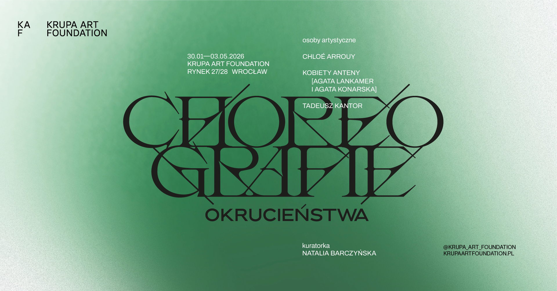 Równolegle Krupa Art Foundation prezentuje wystawę Choreografie okrucieństwa, która koncentruje się na ciele jako obszarze przemocy, kontroli i pamięci. Projekt zestawia prace Chloé Arrouy oraz duetu Kobiety Anteny (Agata Konarska i Agata Lankamer) z obiektami Tadeusza Kantora, tworząc wielogłosową opowieść rozpiętą pomiędzy różnymi porządkami czasowymi.