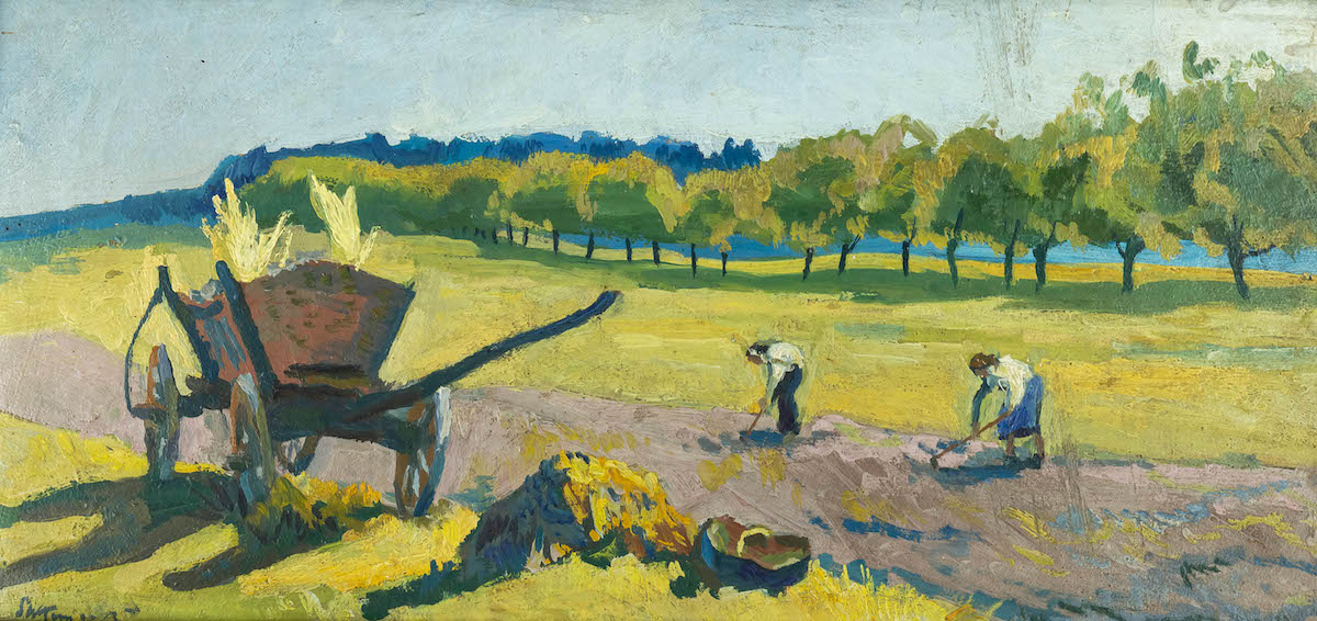 Atrakcyjnym przykładem malarstwa pejzażowo-rodzajowego jest scena „Kobiety pracujące w polu” (poz. 9). Stanisław Kamocki, związany z kręgiem młodopolskim artysta w subtelny sposób połączył obserwację codzienności z nastrojowością polskiego krajobrazu.