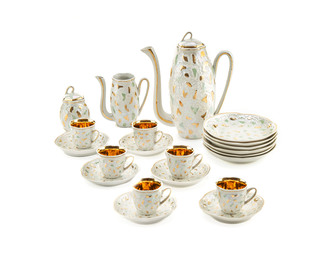 porcelana malowana, złocenie, w skład zestawu wchodzą: dzbanek (4 x 20 x 10 cm), mlecznik (11,5 x 12 x 6,5 cm), cukiernica (11 x 7,5 x 7,5 cm), sześć filiżanek (5 x 7,5 x...