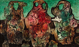 sygn. u dołu kompozycji: lenica, sygn. i opisany na odwrociu: A. LENICA / WARSZAWA / 1960 - 68 / 69 x 93 (olej - tempera) / "CZERWONE UMOCNIENIA" oraz wskazówka montażowa