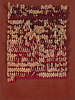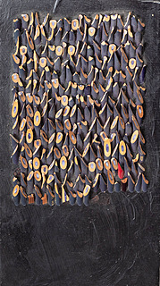 asamblaż, technika właśna, kredki, 50 x 38 cm, na odwrocie nalepka autorska z opisem: 'Bez tytułu | podtytuł: | "Gymnopedie" | 1993 | Andrzej Szewczyk' oraz nalepka z Galerie Ucher z Kolonii z opisem pracy.