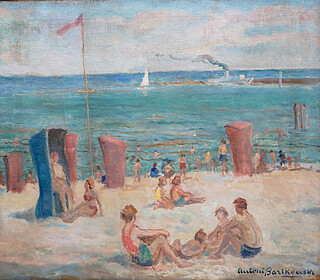 na odwrocie nalepka z opisem dzieła i ceną, na krośnie napis ołówkiem: „SOPOTY”