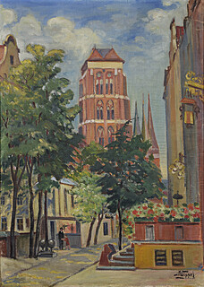 na odwrocie papierowa nalepka CBWA w Łodzi z opisem obrazu wraz z tytułem Kościół N.P. Marii (Gdańsk) oraz datą wystawy: październik 1958.