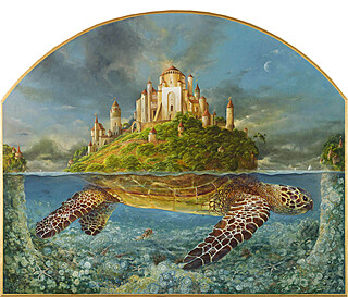technika własna (olej, płyta, ręcznie rzeźbiona rama), 105 x 115 cm,