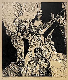 sygn. oł. pod ryc. l.: „Uciszcie krzyk, zniszczyć ich szeptów nie dajcie” 14/15, śr.: linoryt barwny, p.: Czesław Wiącek 72