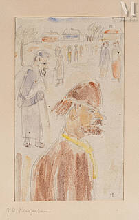 na odwrocie nalepka z informacją o artyście i pochodzeniu obrazu z pracowni artysty w języku francuskim, kartka z odręcznym napisem dłg....