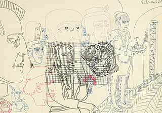 sygn. i dat. śr.g.: E.DWURNIK 1977 (okrągła autorska pieczęć czerwona: RYSUNEK / E.DWURNIK w środku nr 5 094) = "Ustka" (w owalu autorska pieczęć...