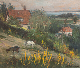 na odwrocie autorska nalepka z opisem pracy: Autor: DZIERZENCKI EUGENIUSZ/Tytuł dzieła: Pejzaż z Sopotu, Rodzaj: olejny/Cena: 1200 zł |2 oraz autorski napis „Pejzaż...