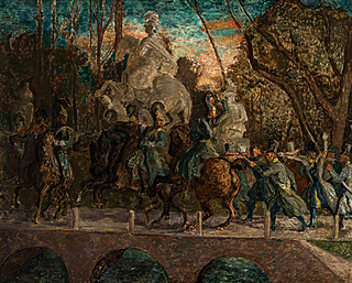 Na odwrocie szkic ołówkiem z przedstawieniem jeźdźca na koniu i towarzyszącej mu postaci.