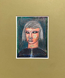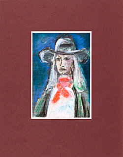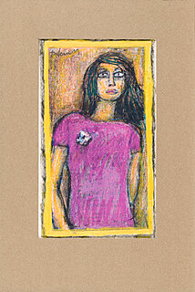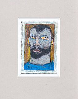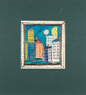 technika mieszana: akryl, akwarela, olejna kredka, papier; 8,2 x 6,7 cm (w św. passe-partout);