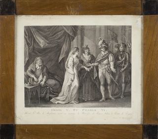 Miedzioryt, 26,5 x 31 cm, sygn. l.d.: G. B. Cipriani Inv. et. del., p.d.: Dirigé par A. Suntach, ś.d.: HENRI V. ET CHARLES VI. / Henri V. Roide Angleterre reçoit en marriage la Princesse de France Selon le Traité de Troyes,...