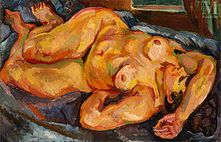 Na odwrocie, na poprzeczce krosna dwie nalepki paryskiej filii domu aukcyjnego Christie’s, gdzie obraz wystawiony był w roku 2005. Ponadto na górnej listwie...
