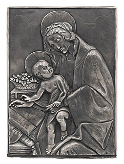 Ikona ścienna z płaskorzeźbą przedstawiającą Madonnę z Dzieciątkiem, punca probiercza HW999, XX wiek.