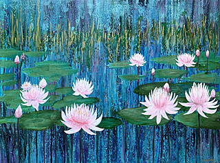 sygnatura, opis, datowanie na odwrociu: ,,Lilie wodne", akryl na płótnie, 120/90 cm, Izabela Drzewieckadodatkowo certyfikat autentyczności na odwrociu