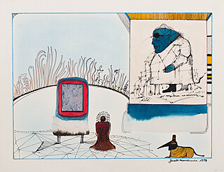 Tusz, piórko, akwarela, kredka; papier; 30,5 x 22,5 cm
