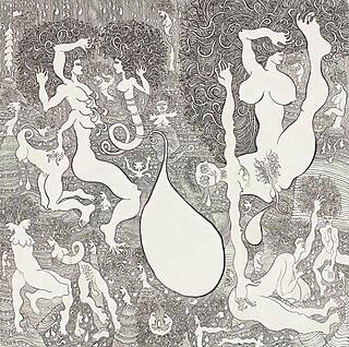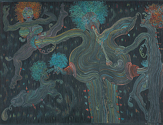 sygn. i opisany na odwrociu: Jan Dobkowski / "PLENEROWE PRZYGODY" 76 (tytuł przekreślony) / TUSZ 100 cm x 100 cm / "WYDARZENIA KOSMICZNE" 76