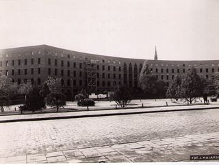 Na odwrocie stempel: Agencja Fotograficzno-Prasowa / Jan Malarski / Chmielna 10, tel. 224-20 / Prawo reprodukcji zastrzeżone; maszynopis: Elewacja frontowa gm. Wydziału Wojskowego przy ul. Florjańskiej...