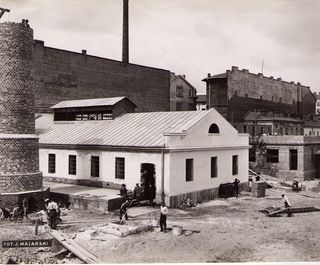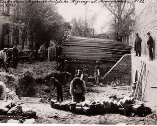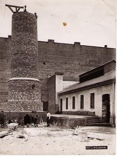 Na odwrocie stempel: Agencja Fotograficzno-Prasowa / Jan Malarski / Chmielna 10, tel. 224-20 / Prawo reprodukcji zastrzeżone; piórem: budowa komina w szp. Sgo Stanisława