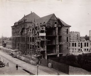 Na odwrocie stempel: Agencja Fotograficzno-Prasowa / Jan Malarski / Chmielna 10, tel. 224-20 / Prawo reprodukcji zastrzeżone; piórem: budowa domu administracji w szp. Przemienienia Pańskiego