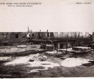 Na odwrocie stempel: Agencja Fotograficzno-Prasowa / Jan Malarski / Chmielna 10, tel. 224-20 / Prawo reprodukcji zastrzeżone; na licu Budowa Miejskiej Stacji Higjeny Zapobiegawczej przy ul....