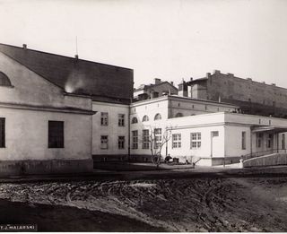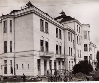 Na odwrocie stempel:Agencja Fotograficzno-Prasowa / Jan Malarski / Chmielna 10, tel. 224-20 / Prawo reprodukcji zastrzeżone; piórem: nadbudowa 1go piętra nad centralnym budynkiem na salę wykładową w szp....