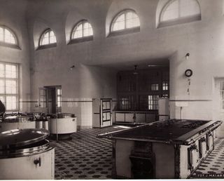 Na odwrocie stempel: Agencja Fotograficzno-Prasowa / Jan Malarski / Chmielna 10, tel. 224-20 / Prawo reprodukcji zastrzeżone; maszynopis: Wnętrze kuchni szp. Sw. Stanisława dnia 13.X.1930 roku