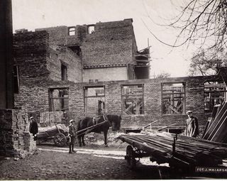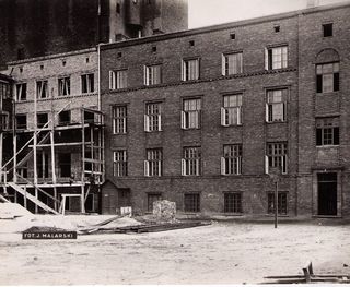 Na odwrocie stempel: Agencja Fotograficzno-Prasowa / Jan Malarski / Chmielna 10, tel. 224-20 / Prawo reprodukcji zastrzeżone;piórem: Połączenie dwóch budynków w bursie dla młodzieży przy ul. Żelaznej 95c.