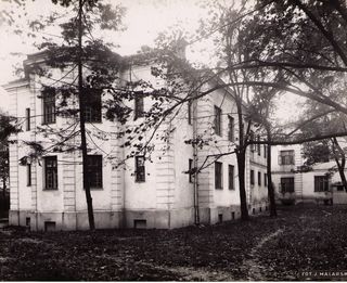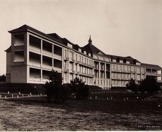 Na odwrocie stempel:Agencja Fotograficzno-Prasowa / Jan Malarski / Chmielna 10, tel. 224-20 / Prawo reprodukcji zastrzeżone; maszynopis: Główny Pawilon Sanatorjum Miejskiego w Otwocku.- dnia 13.X.1930...