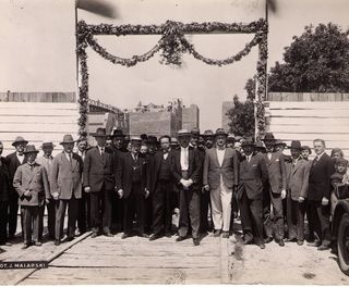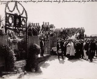 Na odwrocie stempel:Agencja Fotograficzno-Prasowa / Jan Malarski / Chmielna 10, tel. 224-20 / Prawo reprodukcji zastrzeżone; ołówkiem: ul. Gostyńska; na licu: poświęcenie kamienia węgielnego pod bud....