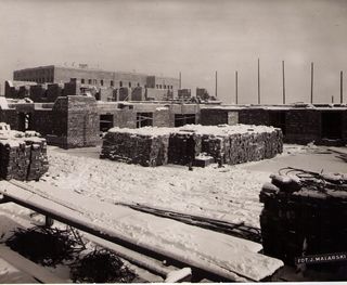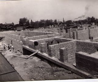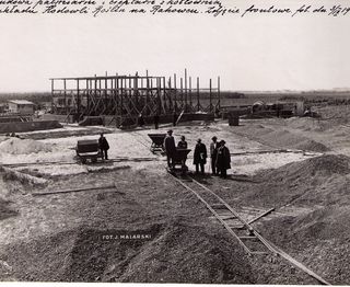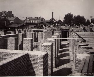 Na odwrocie stempel:Agencja Fotograficzno-Prasowa / Jan Malarski / Chmielna 10, tel. 224-20 / Prawo reprodukcji zastrzeżone; piórem: Budowa pawilonu dla przymusowo leczonych kobiet w szp. Śgo Łazarza