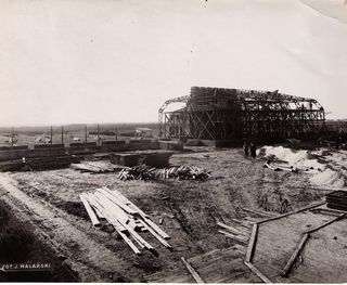 Na odwrocie stempel: Agencja Fotograficzno-Prasowa / Jan Malarski / Chmielna 10, tel. 224-20 / Prawo reprodukcji zastrzeżone; na licu: budowa palmiarni i cieplarni z kotłownią Zakładu...