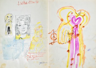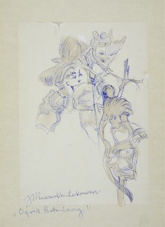 czarny tusz, kredki na podrysowaniu ołówkiem, biała farba olejna na krawędziach arkusza; karton; 23 x 32,5 cm;
