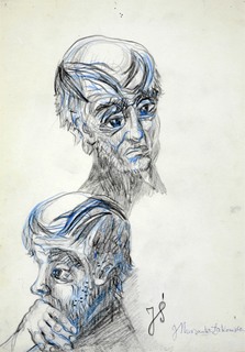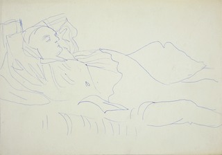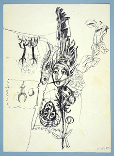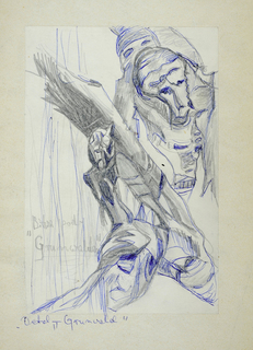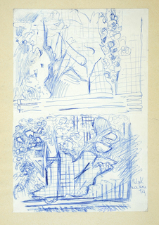 długopis niebieski, tusz lawowany; papier; 21 x 15 cm; naklejony na karton 29,5 x 21 cm;