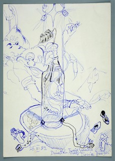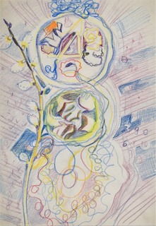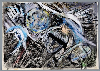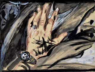 czarny tusz, kredki na podrysowaniu ołówkiem, biała farba olejna na krawędziach arkusza; karton; 23 x 32,5 cm;