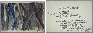 Na odwrocie odręczny napis: ze szmat i ban[d]aży (dopisane d) - / Czy to – HARTUNG? / jak powiadają Koledzy / napisała myśl słodką - / bo...