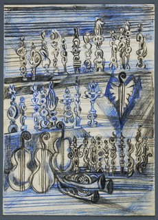 kredki, tusz, gwasz; karton jasnoszary; 37 x 25,4 cm;