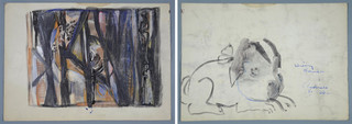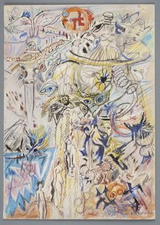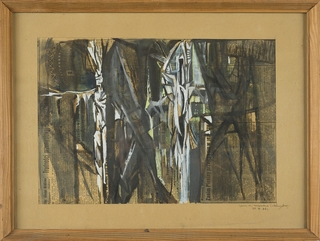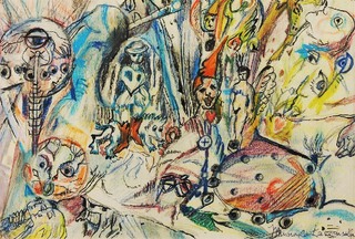czarny tusz, kredki na podrysowaniu ołówkiem, biała farba olejna na krawędziach arkusza; karton; 23 x 32,5 cm;