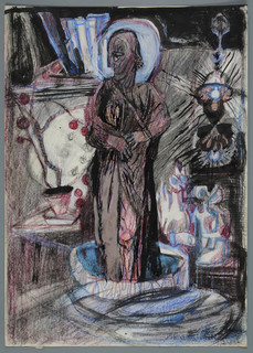 tusz, kreda, pastel, papier; 32,3 x 23 cm;
