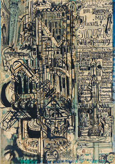 pióro, atrament niebieski, tusz lawowany; karton; 23 x 32 cm;