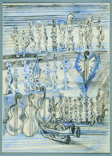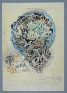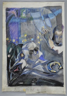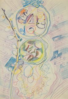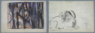 czarny tusz, kredki na podrysowaniu ołówkiem, biała farba olejna na krawędziach arkusza; karton; 23 x 32,5 cm;