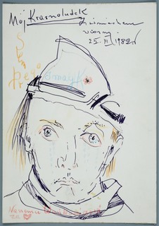 napisy autorskie, u góry: Mój Krasnoludek / z uśmiechem / wiosny / 25. III. 1982 r. (pisakiem czarnym); u dołu: Naszemu Wańkowiczowi / za [znak serca] (czerwoną kredką).