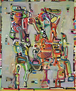 opisany na odwrocie: JAN ANTOSZCZYK / KOMPOZYCJA DNIA 7 - EGO'2023 / OLEJ/PŁÓTNO / 100/120CM.