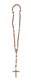 drewniane paciorki, sznurek, metalowy medalik i krucyfiks, sygnowany na odwrocie krucyfiksu: „J. LAMBERT RUCKI/ FRANCE” oraz na odwrocie medalika: „J.LAMBERT/ FRANCE/RUCKI” długość ok. 41 cm
