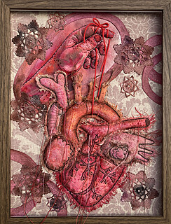 technika własna (obraz uszyty z tkanin lnianych i fragmentów bawełnianej koronki, malowany farbami do tkanin, haftowany bawełnianymi nićmi, symboliczne serce i dłoń 3D wypchane miękkim puchem, zwisające z obrazu nieregularne...