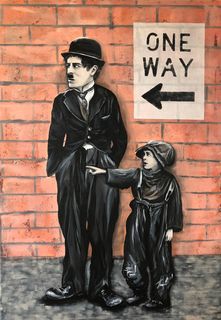 Obraz inspirowany kadrem z filmu "Brzdąc" w reżyserii Charliego Chaplina.