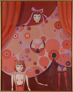 sygn. na odwrocie KMikulski Kraków 1980 "Teatr lalek: różowe przedstawienie", reprodukowany w katalogu Desy Unicum na stronie 20.