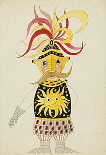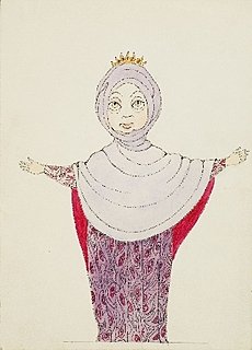 rysunek, tusz, tempera, karton - 2 części (przedstawienie postaci w dwóch kostiumach - jeden nakładany), wym. 23 x 16 cm,