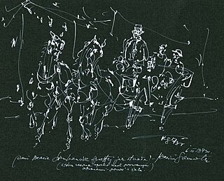 2 – biały tusz, piórko na barwnym papierze, jeden za zielonym sygnowany KS73, drugi na brązowym: 7 III / 1973 / Panu Andrzejowi, który mi o mały włos reki nie złamał...